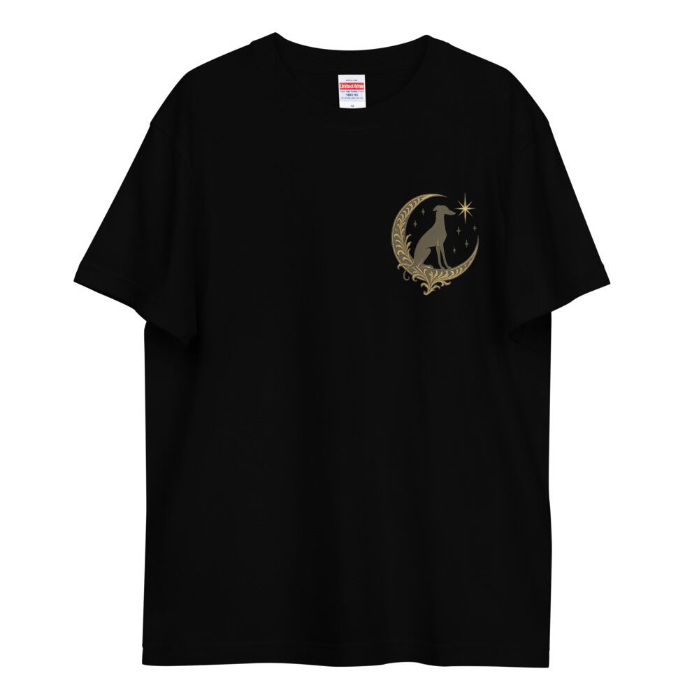 金色に輝く三日月に腰掛け、星空を見上げるイタグレ。